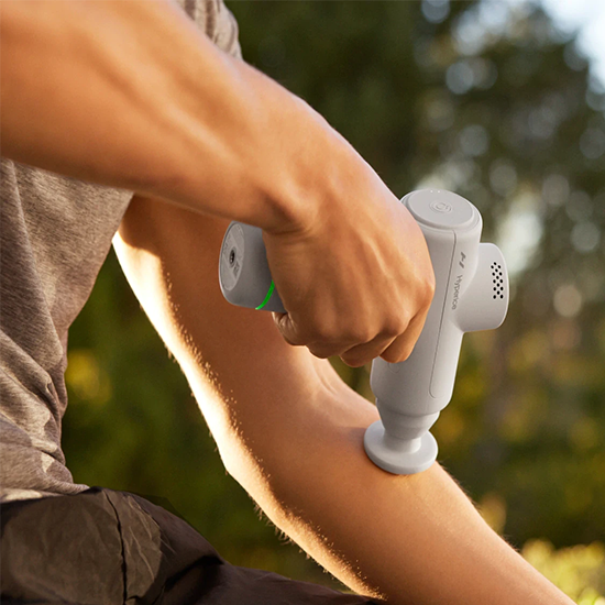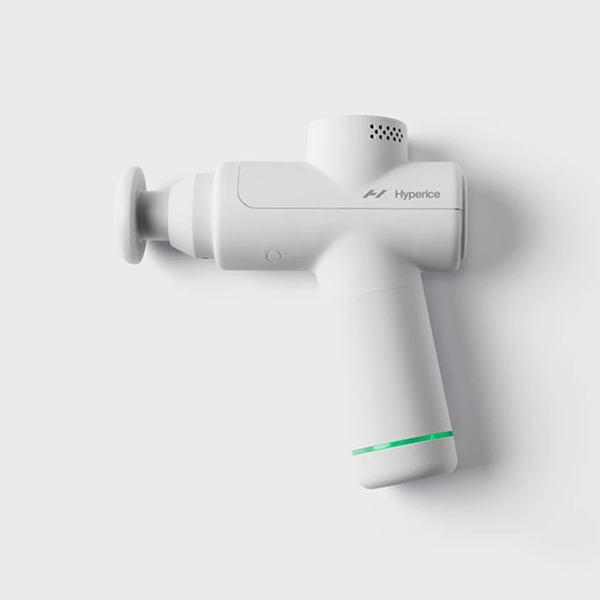 On the go: Compact and lightweight, the Go 2 fits in your hand and in your bag. Press and hold the power button located at the bottom of the handle. Release it once the LED lights illuminate, indicating it's powered on. You can then select your desired speed setting to start using the device. Your Hypervolt Go 2 will not operate while connected to the charging cable