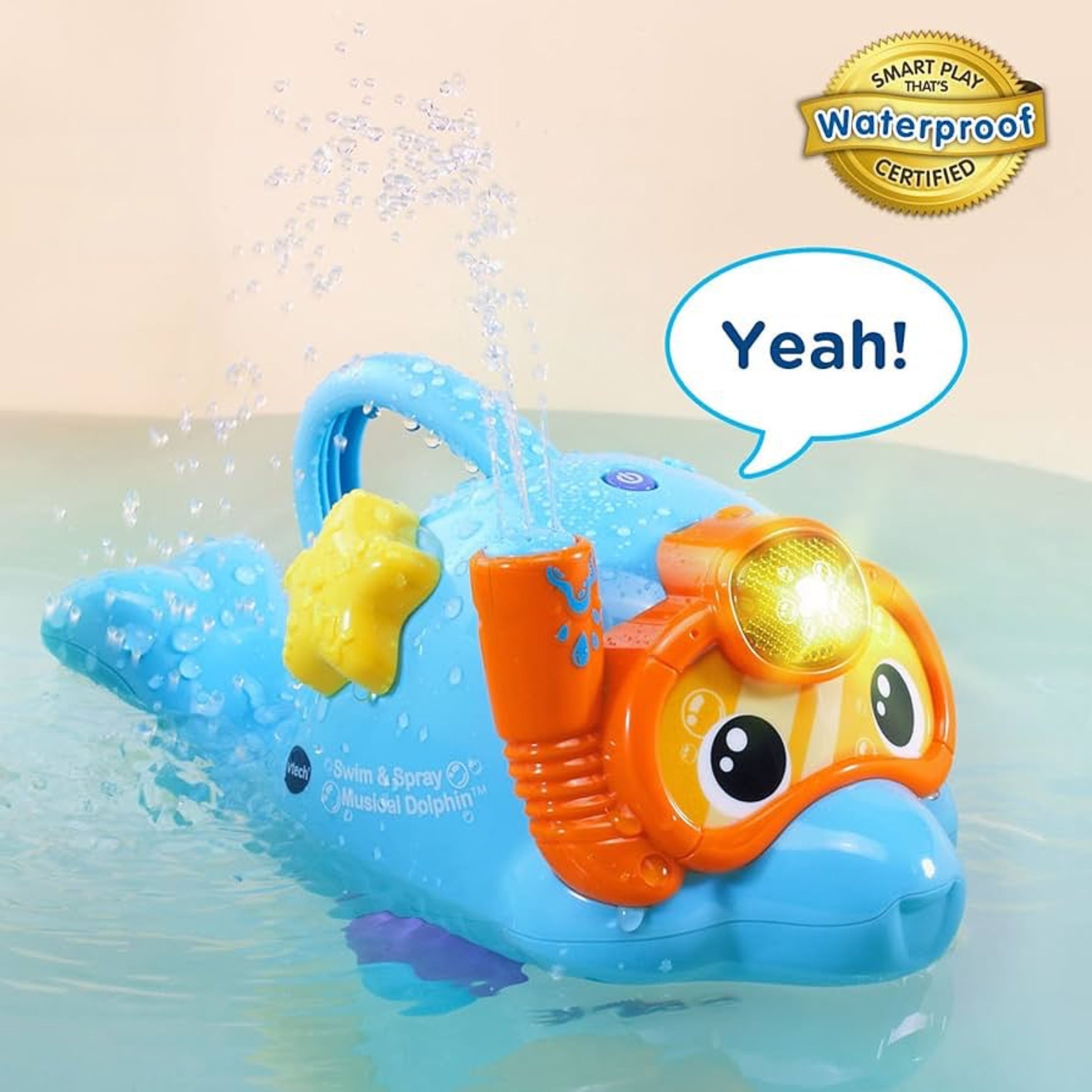 Dive and play with the Swim & Spray Musical Dolphin™ by VTech®. Pour water over the friendly little dolphin, and he’ll spray water from his snorkel. Water sprays from this bath toy in different patterns and intensities based on the music for fun tactile and visual stimulation. Twist the starfish on his side to build fine motor skills while hearing more than 55 fun sounds, phrases and melodies. The dolphin’s face mask also lights up and flashes with the sounds to attract your little one’s attention. Grab the chunky handle and dive the dolphin in and out of the water while triggering lights and sounds. It’s water spraying and singing fun!
