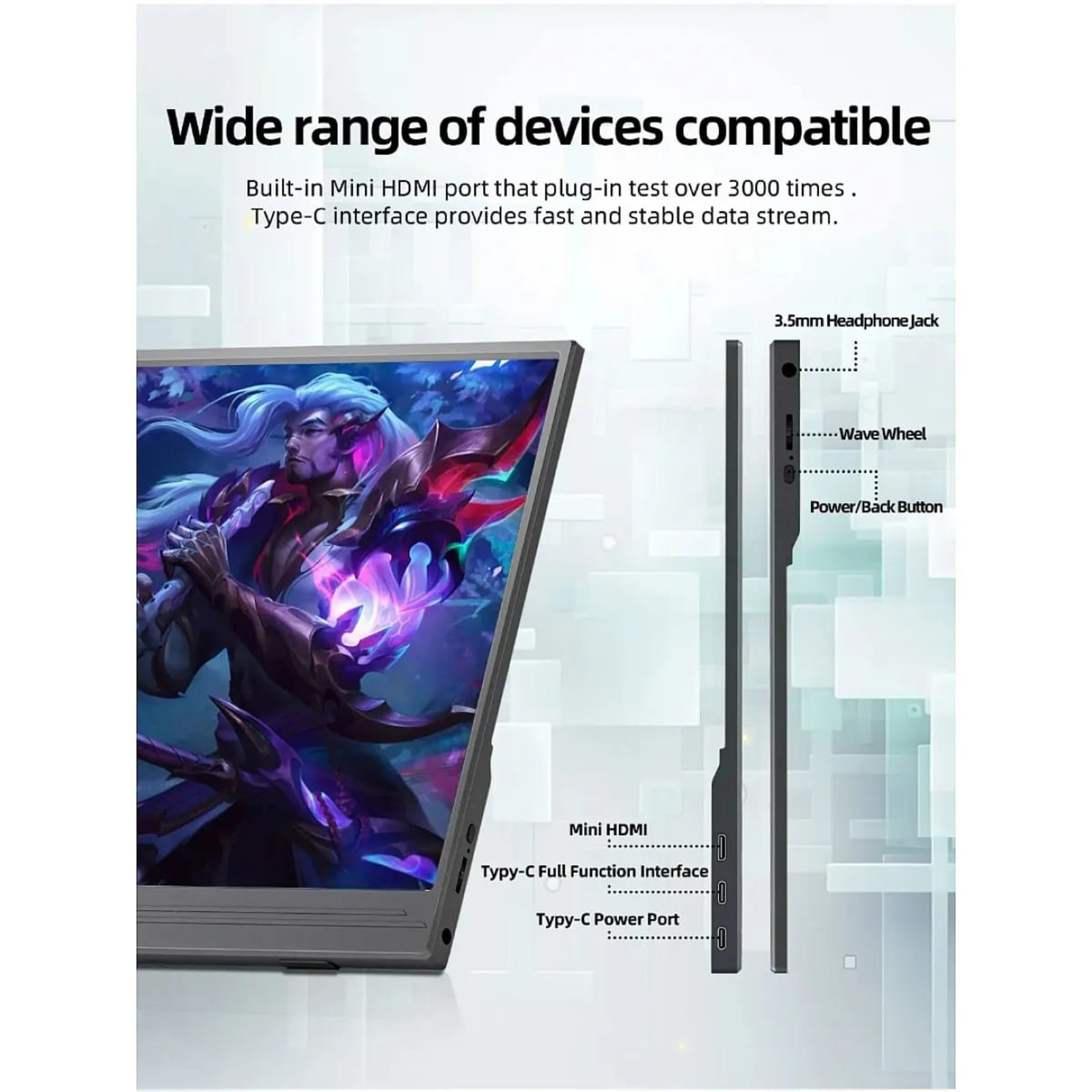 NEW 15.6 Inch IPS monitor with 60HZ high frame rate 1080p Ultra HD 1920*1080 high resolution and HDR; Adopts IPS screen 72%sRGB , 178° viewing angle delivers you brighter, crisper, and more natural colors, bringing a more vivid visual enjoyment.